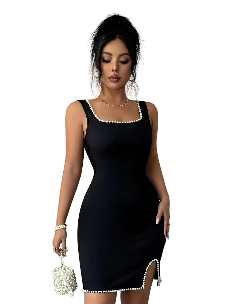 Damska elegancka sukienka mini z perełkami i rozcięciem
