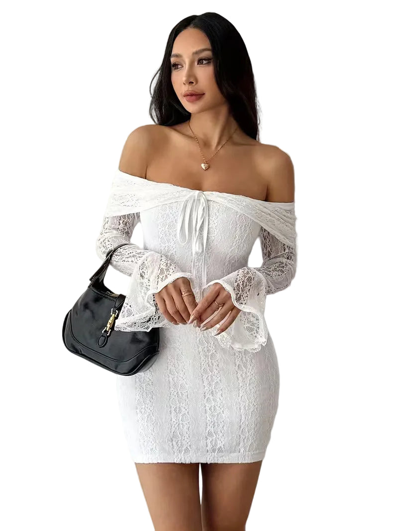 Damska koronkowa sukienka mini z odkrytymi ramionami i długim rękawem