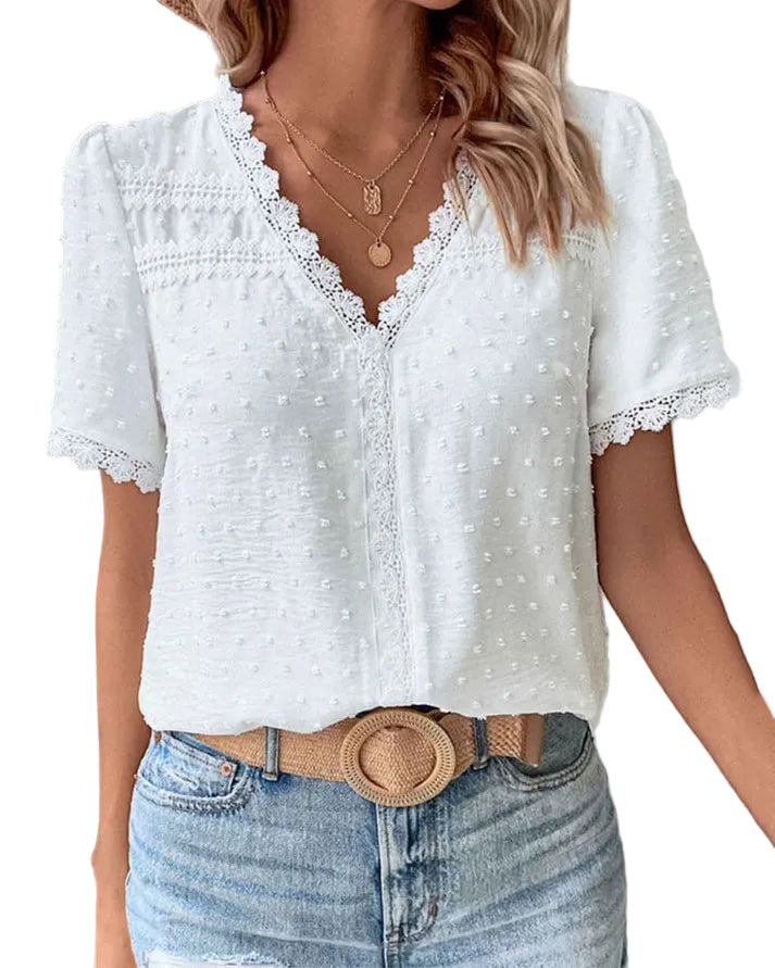 Damska bluzka z krótkim rękawem i dekoltem V z koronkowym wykończeniem