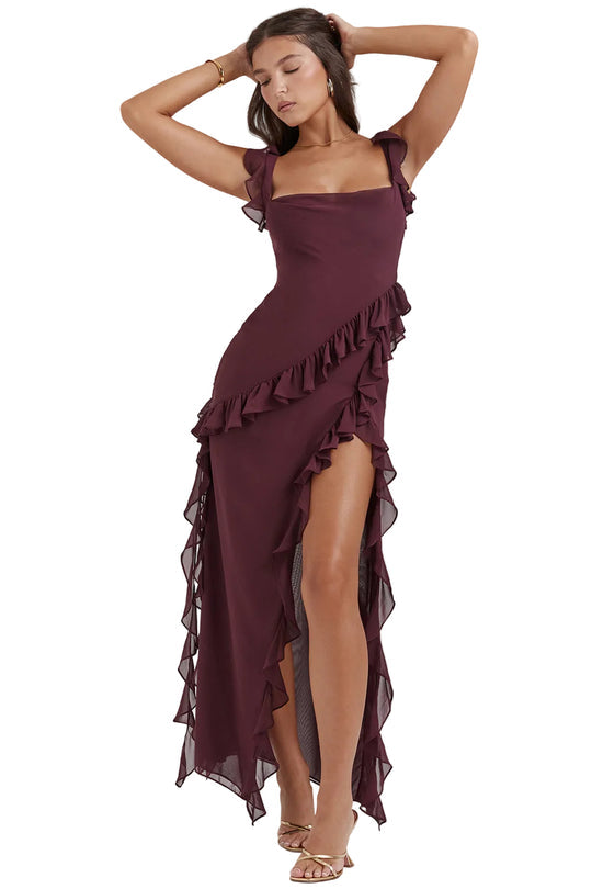Damska długa sukienka z falbanami i rozcięciem