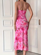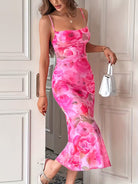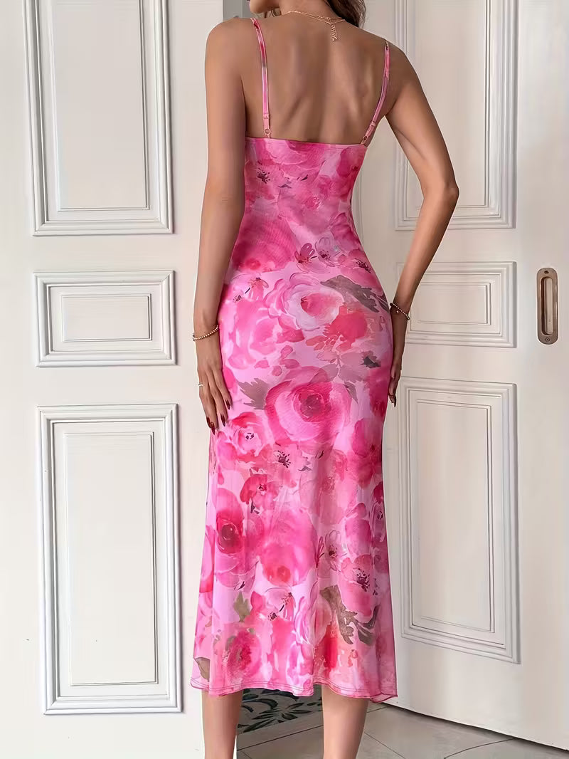 Elegancka damska sukienka midi o dopasowanym kroju, która pięknie podkreśla sylwetkę. Model na cienkich ramiączkach z kobiecym dekoltem wyróżnia się efektownym kwiatowym wzorem, nadającym stylizacji świeżości i romantycznego charakteru. Idealna na letnie wyjścia, przyjęcia, randki oraz wyjątkowe okazje.