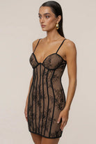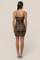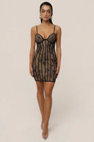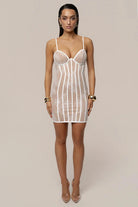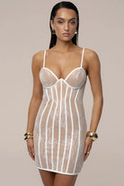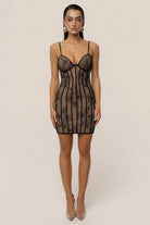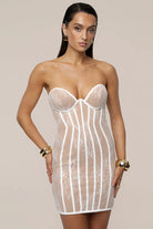 Damska sukienka o dopasowanym kroju wykonana z materiału o koronkowej strukturze. Model posiada konstrukcję gorsetową z widocznymi pionowymi przeszyciami oraz usztywnioną górną część bez ramiączek. Koronkowa warstwa zewnętrzna osadzona jest na półprzezroczystej bazie materiałowej. Długość sięga do połowy uda, a całość zachowuje nieusztywnioną formę dolnej części.