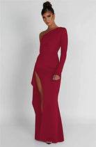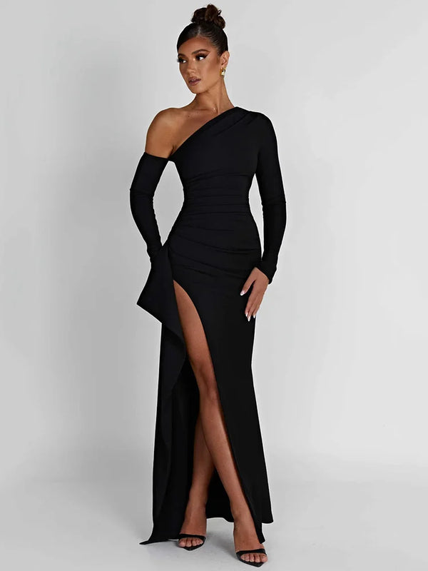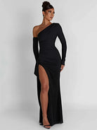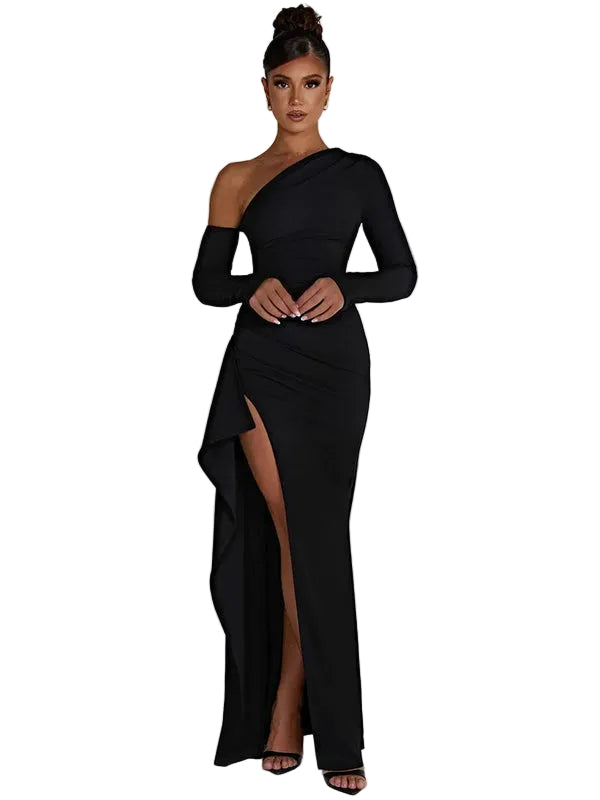Damska sukienka maxi na jedno ramię z długim rękawem i rozcięciem