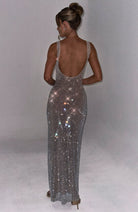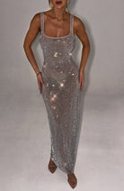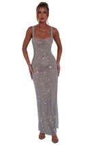 Damska sukienka maxi o prostym, dopasowanym kroju. Model posiada szerokie ramiączka oraz prostokątny dekolt. Powierzchnia wykonana jest z drobnej siateczki z równomiernie rozmieszczonymi, połyskującymi elementami. Sukienka sięga do kostek i zachowuje nieusztywnioną konstrukcję.