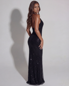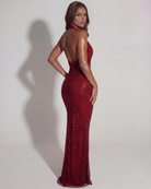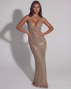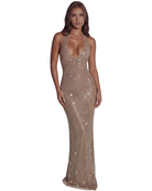 Damska sukienka maxi o dopasowanym kroju z dekoltem typu halter. Model posiada głęboki dekolt w kształcie litery V oraz odkryte plecy wynikające z konstrukcji halter. Powierzchnia sukienki jest jednolita i pokryta drobnymi, połyskującymi elementami. Długość sięga do ziemi, a całość zachowuje nieusztywnioną formę.