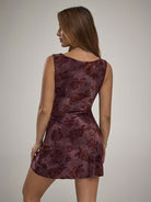 Damska sukienka mini o dopasowanym kroju. Model bez rękawów z zabudowanym dekoltem. Całość pokryta nadrukiem w motyw róż. Fason podkreślający sylwetkę, gładki materiał. Odpowiednia do stylizacji codziennych oraz wieczorowych.