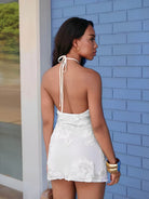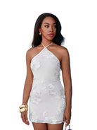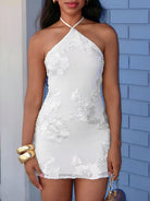 Damska sukienka mini o dopasowanym kroju z dekoltem typu halter. Model bez rękawów, z wiązaniem przy szyi. Materiał z koronkową aplikacją o kwiatowym motywie. Odpowiednia do stylizacji okazjonalnych oraz wieczorowych.