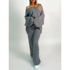 Damski zestaw wykonany z dzianinowego materiału o prążkowanej strukturze, składający się z kardiganu oraz długich spodni. Kardigan posiada dekolt w kształcie litery V oraz zapięcie na guziki umieszczone na przodzie. Rękawy są długie i mają luźniejszy krój. Spodnie wyposażone są w elastyczny pas oraz proste nogawki o pełnej długości. Całość zachowuje jednolitą strukturę materiału i spójną formę konstrukcyjną.