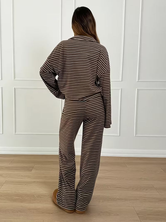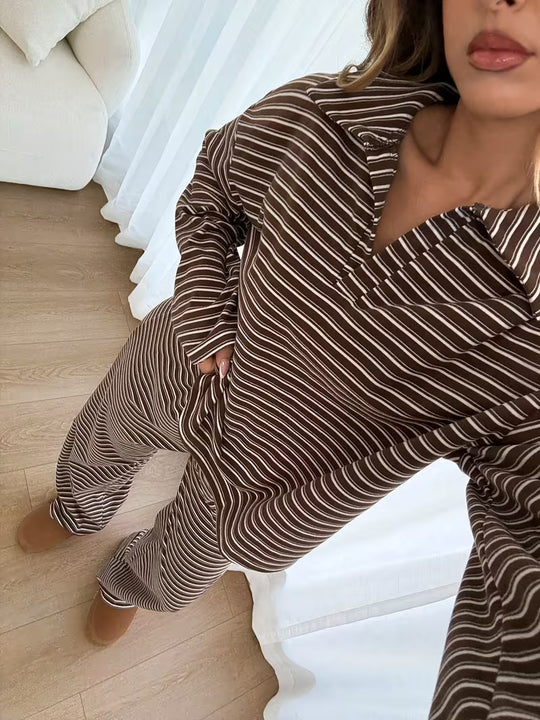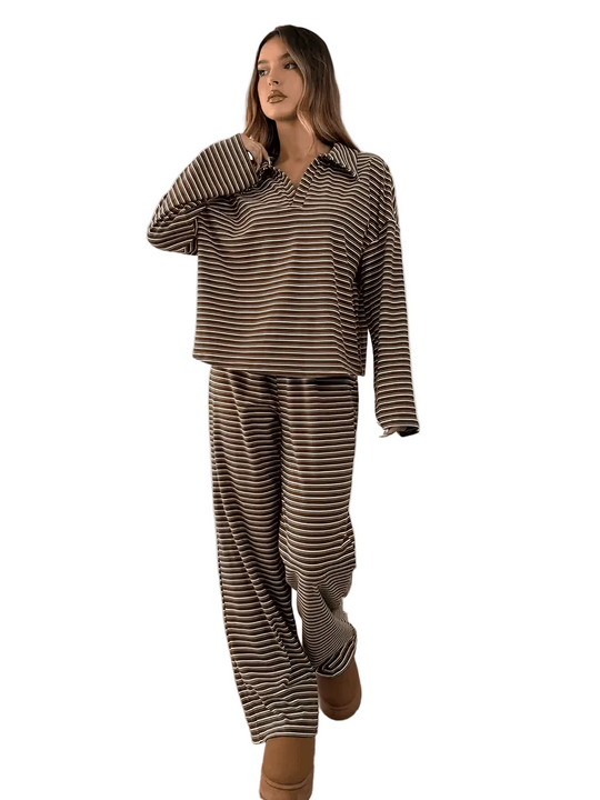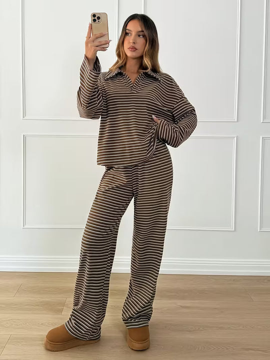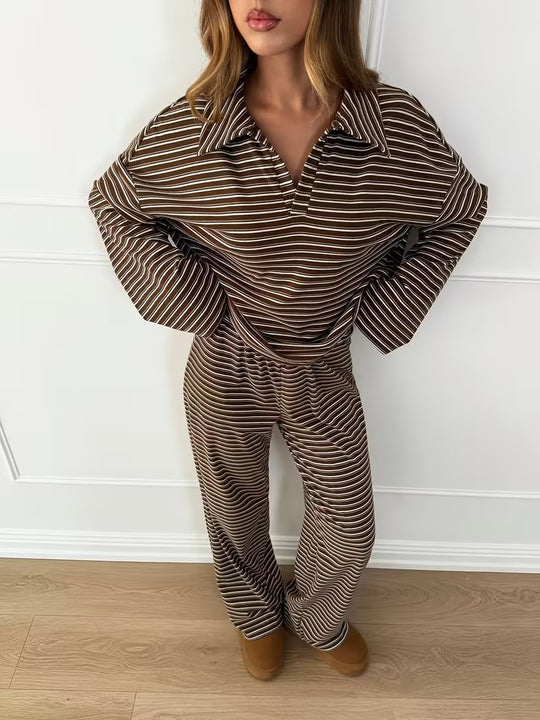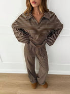 Damski komplet w paski z bluzą z kołnierzykiem i szerokimi spodniami