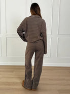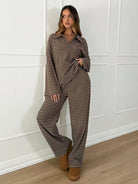 Damski komplet wykonany z miękkiej, elastycznej dzianiny. Zestaw składa się z luźnej bluzy z kołnierzykiem i dekoltem w kształcie litery V oraz spodni z wysokim stanem i szeroką nogawką. Wzór w paski nadaje całości casualowego charakteru. Model zapewnia wygodę noszenia i swobodę ruchów. Idealny do codziennych stylizacji, na spacer, zakupy lub jako komfortowy zestaw domowy.