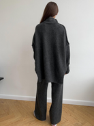 Ten damski zestaw dzianinowy składa się z górnej części z długimi rękawami oraz spodni o prostym kroju. Górna część posiada wysoki golf oraz szerokie wykończenie dolnej krawędzi i mankietów. Spodnie mają proste nogawki na całej długości. Na powierzchni materiału widoczna jest jednolita faktura dzianinowa. Produkt nie posiada widocznego zapięcia ani brandingu.
