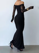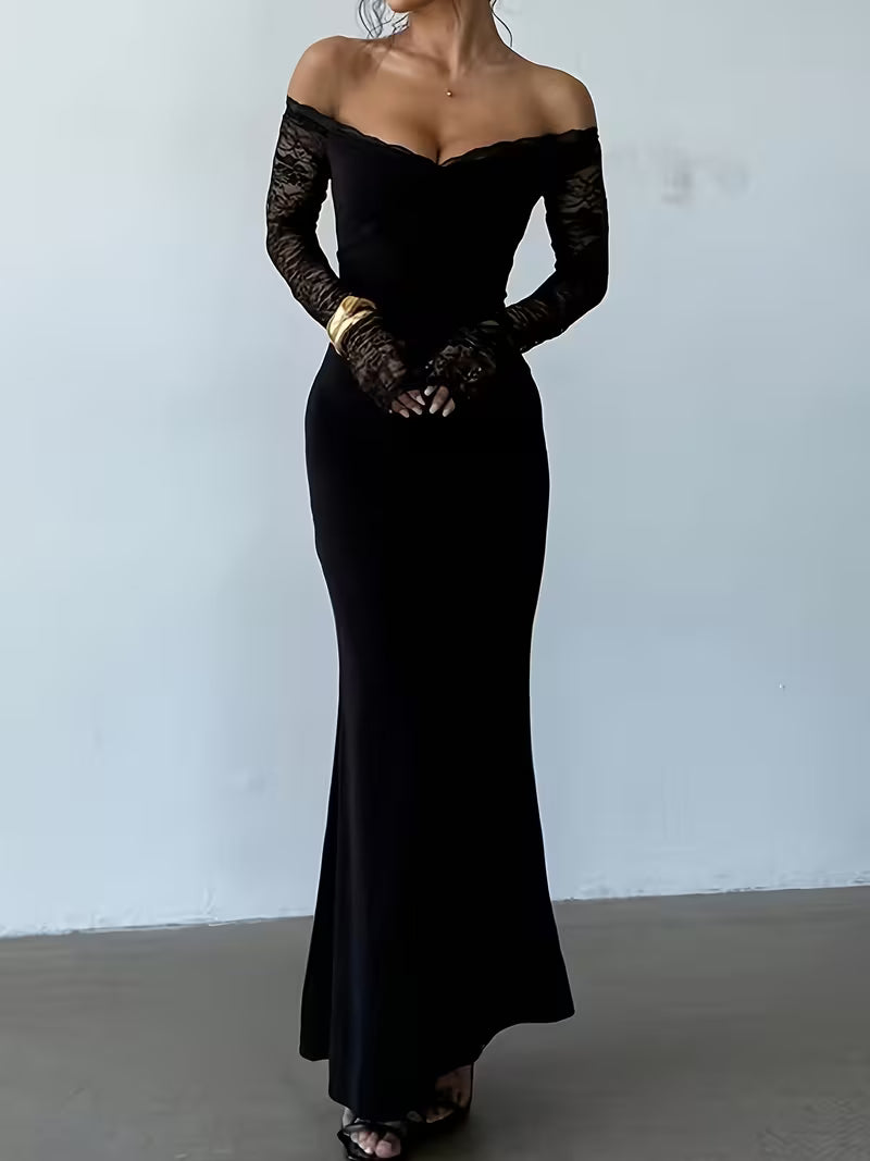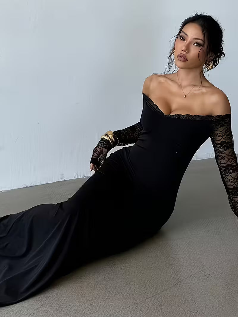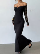Damska elegancka sukienka maxi z odkrytymi ramionami i koronkowym rękawem