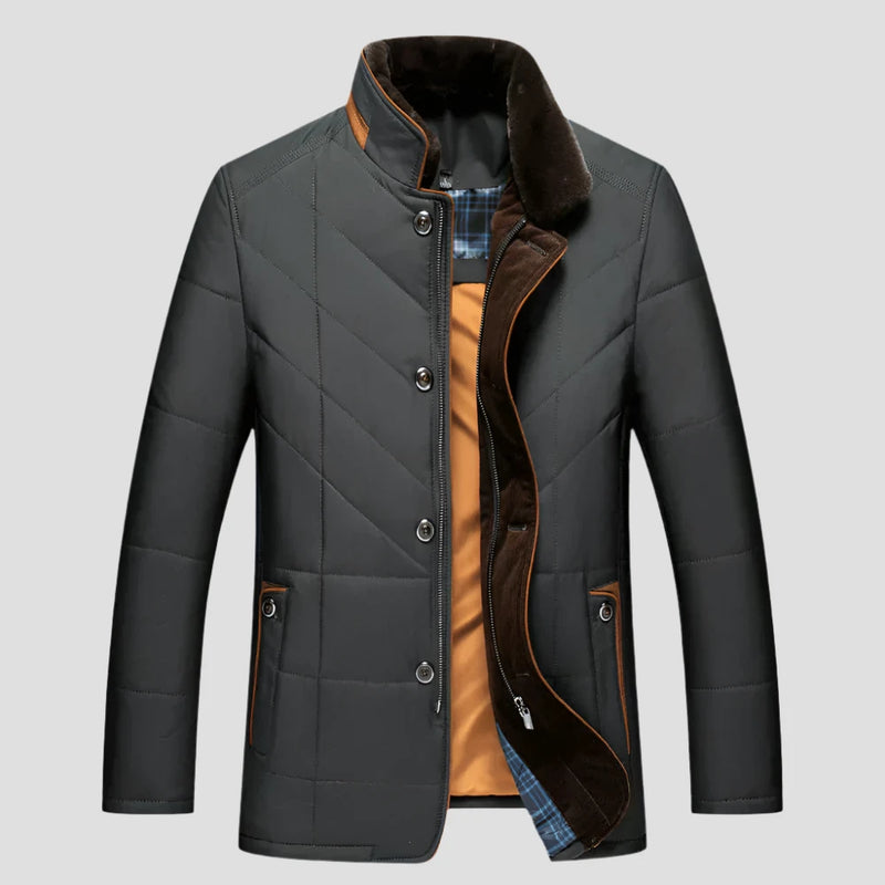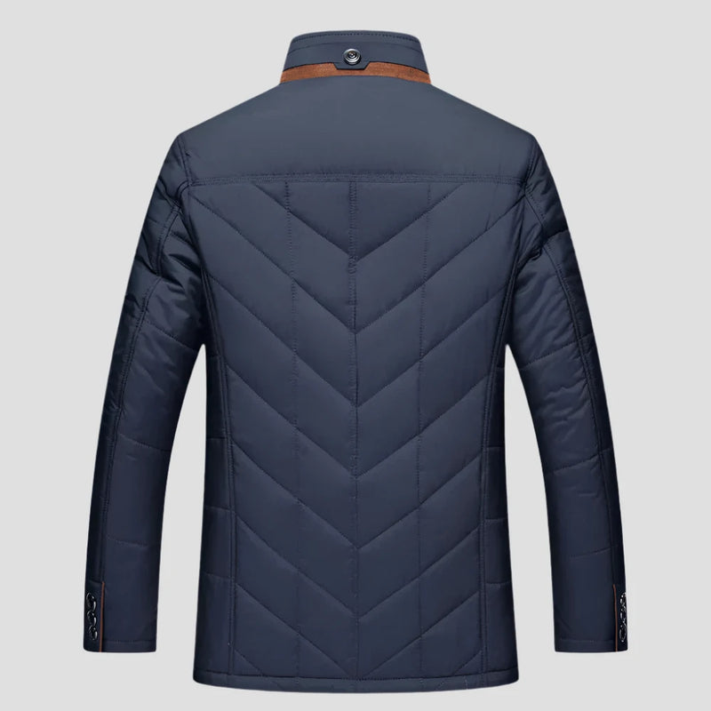 Męska kurtka o pikowanej konstrukcji i prostym kroju. Model posiada stójkę oraz zapięcie na guziki z przodu. Wyposażona jest w kieszenie boczne. Wnętrze posiada podszewkę zapewniającą dodatkowy komfort użytkowania. Długie rękawy wykończone są prostym mankietem. Odpowiednia do stylizacji codziennych w sezonie przejściowym i chłodniejsze dni.
